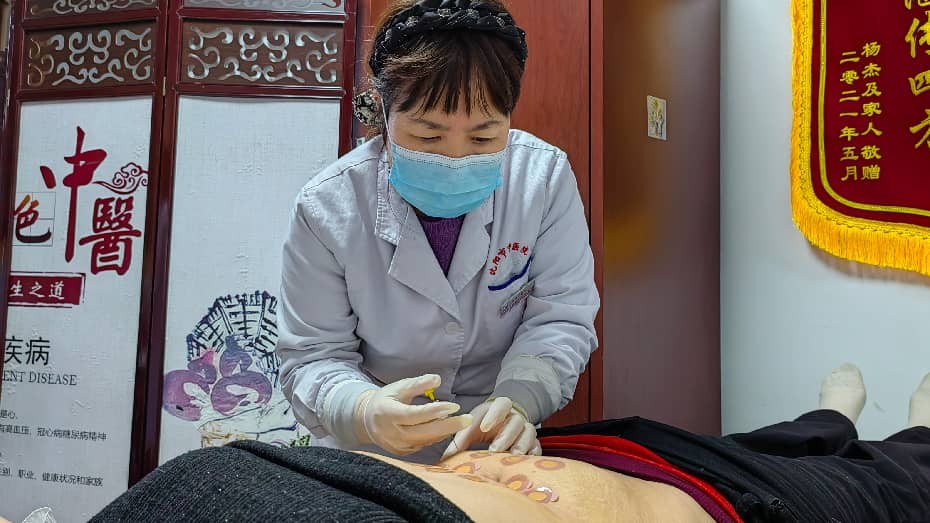 沈阳市中医院健康体重管理门诊主任孟宏为减重患者做穴位埋线治疗。
