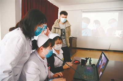 沈阳经济技术开发区人民医院二楼医护人员与驰援武汉的同事进行视频连线。