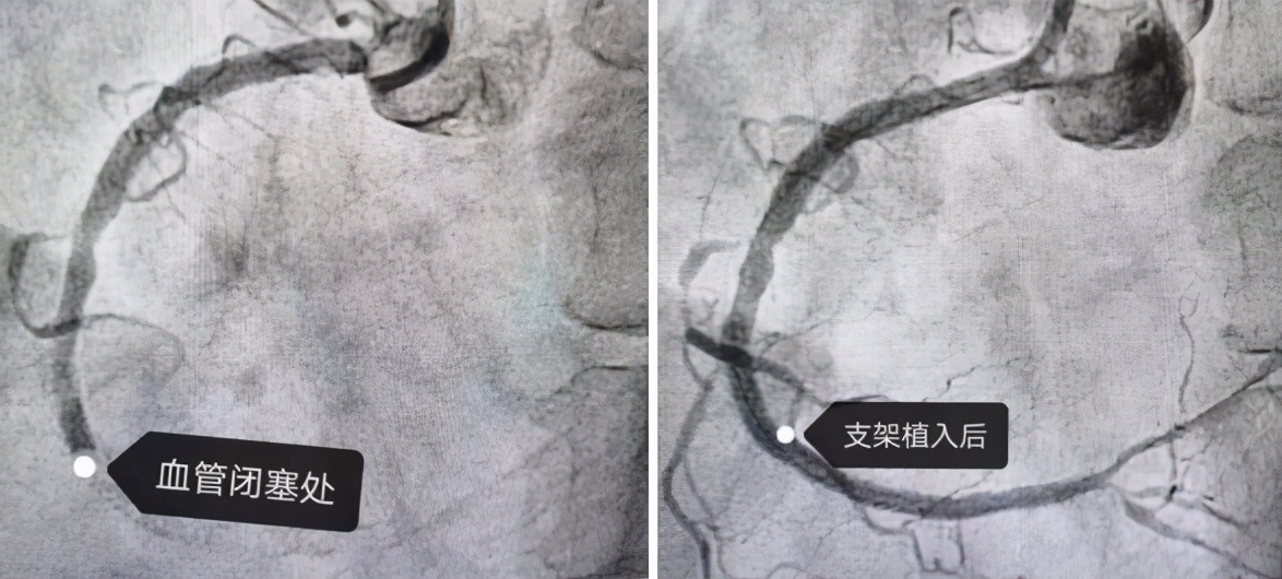 沈阳市第一人民医院心血管内三科主任医师杨新滨放弃休息时间,与介入团队及导管室多科室紧密合作,迅速行急诊冠脉造影,术中显示:右冠中段100%闭塞,局部可见血栓影,于右冠植入支架1枚,术后患者胸痛缓解,转危为安。