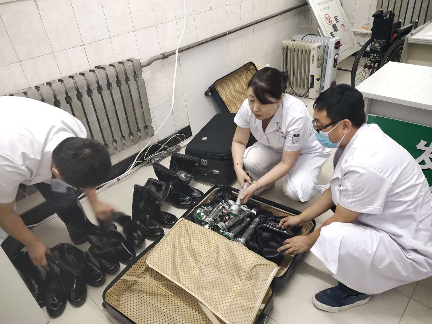 集结完毕后,防汛应急医疗队成员立即带上急救箱乘救护车奔赴伤者所在地。到达伤者所在地点后立即对患者进行检查,发现患者头部被砸伤、右上肢活动受限,怀疑骨折,外科医生立即对其进行紧急处理。在对患者头部受伤部位进行紧急包扎、右上肢夹板固定后,将患者转至医院进行进一步检查和治疗,演练圆满结束。