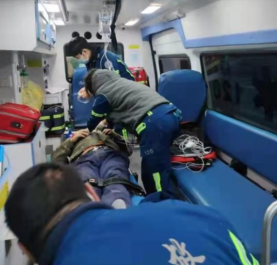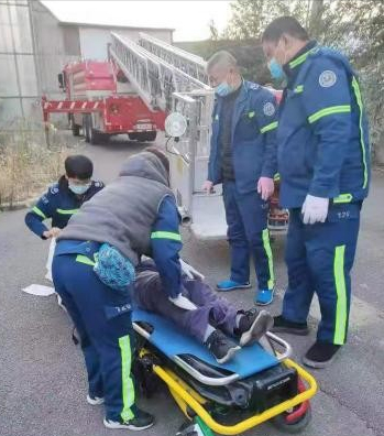 急救小组迅速抵达现场后,现场人员告知伤者在两层楼高厂房房顶,房顶的工友喊话告诉医生目前伤者清醒、头发部分被扯掉、脚疼,芦娜医生叮嘱工友不要让伤者随意活动,护士马天宇在一旁已经准备好输液及包扎用物。随后消防车抵达现场,急救人员与消防员协作配合,借助云梯将伤者运下。此时伤者意识清醒,自述心慌。芦娜医生快速查体发现患者头顶有一处约3x3cm大小的头皮破溃,左足有大面积破溃。芦医生判断两处破溃是电流穿过人体所致,不能排除有内脏损伤。急救人员知道一旦有内脏损伤会随时危及生命,伤者目前情况十分危险,必须尽快抢救送往医院。医护人员默契配合争分夺秒,迅速对头部、左足完成包扎。随后护士马天宇遵照医嘱开通静脉通路、吸氧。完成现场处置后伤者被安全转移至急救车内,急救人员一直密切监测着伤者的各项生命体征,随后伤者被安全送至医院进行下一步检查治疗。
