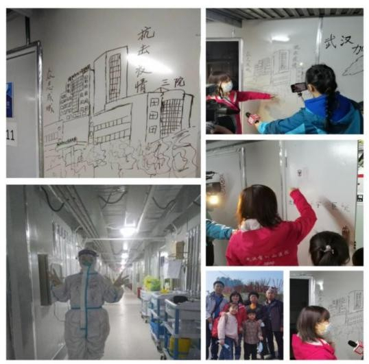 3月14日的早上,驱车1个小时,重返雷神山时,本以为家人们会说“这里好棒啊!”没成想女儿疑惑地问:“妈妈,这里这么破?”“这里一点都不破,这里的病房是简易板房,但是里面的医疗、通讯、水、电等各种设施都是中国人用10天时间建成,而且投入使用,在这里工作处处都体现了中国速度、中国力量。”关晓宣赶紧解释。听了这话,女儿将信将疑,带着家人走进走廊、病区,向他们介绍一路的壁画,讲述当初自己每天的工作步骤,时不时语塞,因为当时的场景会在眼前回放,就仿佛是在昨天。