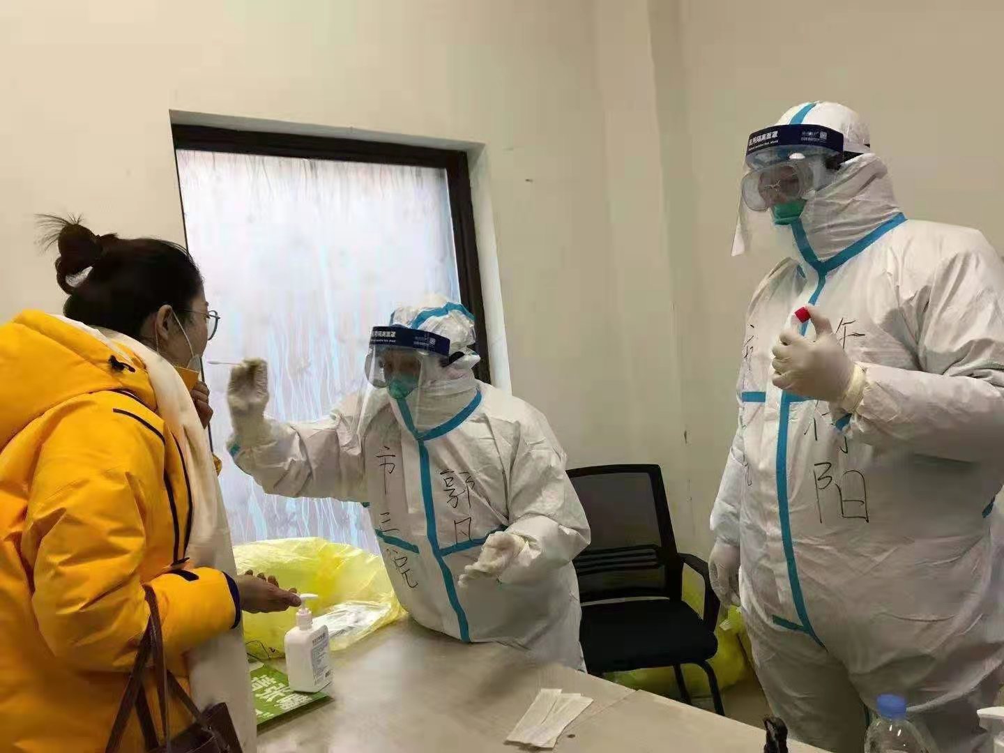 1月2日,坐标于洪阳光尚城小区。社区主任对我们说:"医生同志们,真是抱歉,我们今天的任务是入户采集,不巧昨晚小区电工站意外失火,导致小区高层所有电梯停电,只能爬楼梯上去了",说完将入户名单递给我们。我们5人迅速整装出发,邹宇、刘晔辰和孙雪静主动请缨:"郭姐,高层交给我们"我拿起名单仔细一看:10楼、14楼、18楼!!!我的天呐,我不禁呼出声来。这些孩子们顾不上我的惊呼,拿起名单就上去了,从14楼下来,孩子们的护目镜和面屏上全是水,也分不清是汗水还是水蒸气,小静拖着一百七八十斤的体重说:真的喘不上气了,我恨不得把口罩扯下来喘口气儿。"当天我们共入户37家。任务结束,我们几个连返程大客的四级台阶都上不去了。辛苦吗?真的很辛苦。但也不乏温暖,开门的大爷大妈对我们说:"谢谢你们了,快进屋暖和暖和,给你们倒杯热水?"可是我们身穿防护服,不是万不得已,哪里敢轻易走进居民家里,我们不想带给他们哪怕是一丝丝的风险。他们的理解配合和温暖的话语,便是我们对抗寒冬最给力的热度。歇息半晌,回到车上,我看到了已经累得在座位上睡去的陈德林主任、郭凡主任、耿艳春主任,他们都是医院专家级的主任,都已年近六旬,却在这危难时刻主动请缨,与年轻人一起战斗。那一刻,我真是有点心酸、心疼、更是感动。榜样就在眼前,面对疫情,绝不退缩!
