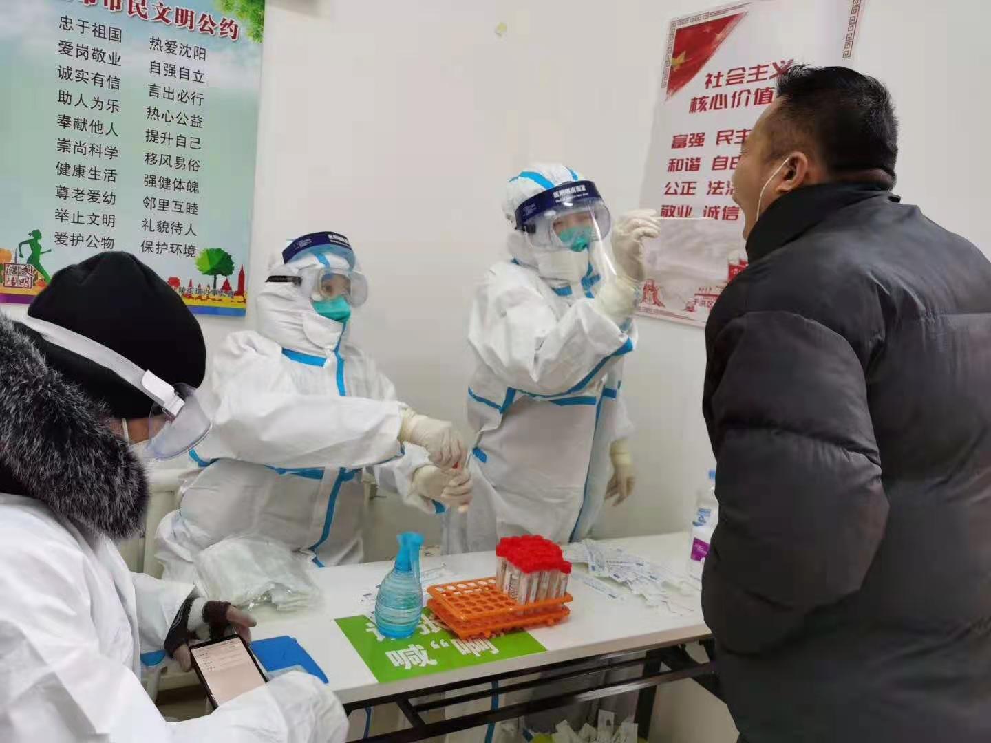 我们这组一共40人,年纪最大的高阳大姐58岁,年龄最小的是98年出生的美小护。大家两人一组,分布到各个社区点位。我和曲艳主任、王智慧等8人被派往于洪区广厦绿园小区,这个小区距离沈阳市第一个被封闭管理的华润橡树湾小区距离不足五百米。说实话,第一天上岗,又是在距离疫区如此之近的位置,大家的心里难免都有些忐忑,而且2021年的1月1日是真冷啊,沈阳8年以来最寒冷的新年。可是,看到在寒风中排着长队,冻得瑟瑟发抖的居民们,所有人二话不说,立马换好防护服,为居民进行核酸检测。从登记排号到咽部采集,平均20多秒一位。不知不觉间,三个多小时过去了,我们共采集核酸1550人次,圆满完成采集任务。