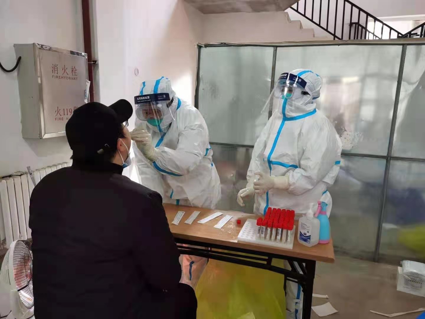 1月5日,我们小组来到沈阳市于洪区朝鲜一中小区和宏达社区。朝鲜一中小区,是个老旧小区,环境很差,没有物业办公室,大家在室外临时搭起一张小木桌摆放采集物品,为居民做检测。当时已是下午4点,天色已暗,室外零下20多度,带着双层防护手套,严格执行一洗一手消,胶皮手套外涂上手消凝胶,针扎般的刺骨冰冷瞬间传遍全身,那种滋味,真是无法言喻。两个小时过去,我和队友手已经冻得肿胀,没了知觉,连采集管里的试剂都结成了冰。就在这时,来了一位年轻的母亲,领着一个不到四岁的小男孩儿。妈妈先做完检测,抱起孩子,可小男孩哇哇大哭,死活不配合检测,妈妈连哄带吓都不管用。我们一边安慰孩子一边对妈妈说:"要不让孩子爸爸过来帮你一下吧,你一个人弄不了。"孩子妈妈哽噎道:"孩子爸爸被隔离了,所以我必须要给儿子检测。"说完一手抱起孩子,一手狠心捏住孩子的鼻子,让孩子被迫张口大哭,天书瞅准时机立即将棉签探到孩子咽部迅速完成标本采集。看着这个跟我儿子差不多大的小男孩,看着搂紧儿子哭到不能自己的年轻母亲,我的心瞬间疼到抽搐,泪水连着汗水和雾气溢满护目镜。