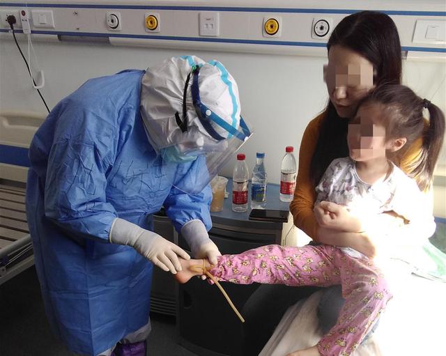 进入隔离区,除了正常的工作外,还为年幼的小患儿进行核酸检测采样工作。印象最深的是一位境外来沈的外籍小女孩。由于孩子年龄小,语言不通,孩子配合度较差。身为人母的我发挥出自己的十八般武艺,连哄带劝外加手比划,护目镜很快蒙上了一层雾气,视线很不好,只能使劲的低着头,让水珠顺着镜片流下,在水雾的缝隙中评估血管。孩子在机场已经验过血,两侧的手臂血管都已经有过穿刺,只能在脚踝上仔细寻找,待我使出洪荒之力终于顺利完成了血标本的采集,才发现更具挑战的还在后面。