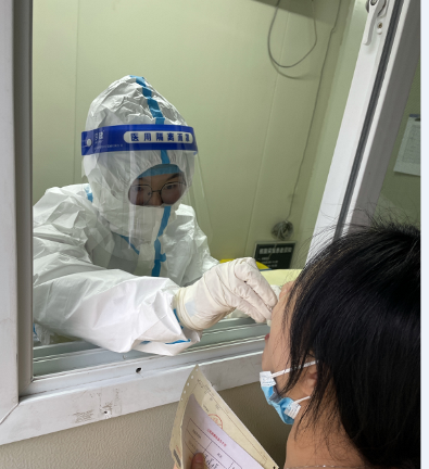 本轮疫情发生后,医院的核酸检测需求量剧增,为了更好更快更安全地完成任务,减少人员聚集逗留,核酸采样点、检测点的医务人员像奥运健儿一样,拼着世界第一的中国速度,用热情周到的服务进行核酸采样、用娴熟精准的动作进行核酸检测。三伏天里,不少人都在吹着空调,吃着西瓜,看着奥运,但此刻核酸采样点、检测点的五院担负核酸检测任务的检验人员,却在30多度的高温下裹着密不透风的防护服,每天享受着"桑拿房"的洗礼,勒紧眼前的护目镜,忍着生理期的不适,他们是离病毒最近的人,是疫情防控的先锋官,即便如此,依旧无怨无悔。
