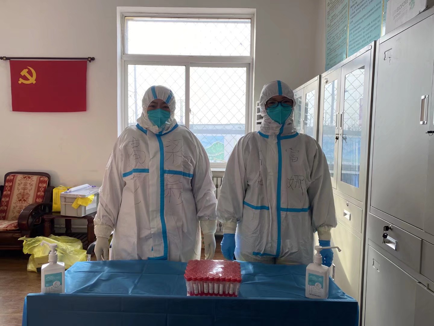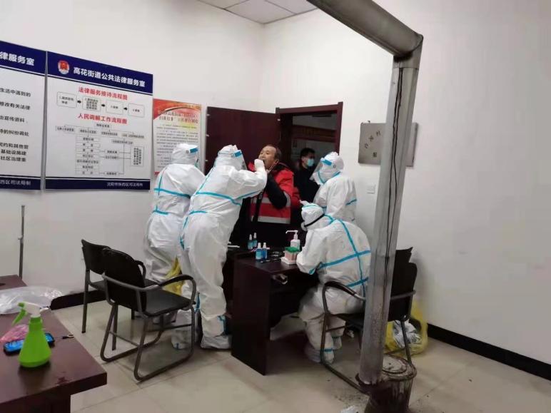 这次的铁西区全民核酸采集工作时间紧迫,任务重大,根据沈阳市当前的疫情防控形势,必须三天全部完成居住在高花街道6千多户、1万多人的咽拭采集工作。我街道有13个村委会,按照院领导的紧急部署,分成4个采集点,2组在中心小学固定采集,另2组分别在各村流动采集,我被分到了流动组。就此由16名医务工作者和12名社区工作者组成,筑起了一道守护人民生命安全的防火墙,随即这场没有硝烟的战"疫"就此拉响。由于有安置点的工作经验,加上紧急的现场培训,我很快熟知了工作流程,注意事项和严格的防护措施。穿上这从头到脚包裹严实的防护服,戴上这密不透气的口罩和遮掩全无、只露一对小眼睛的防护面屏,一种神圣的责任感、使命感油然而生。我们凭借着身上各自的名字认出对方、彼此协作、互相加油。