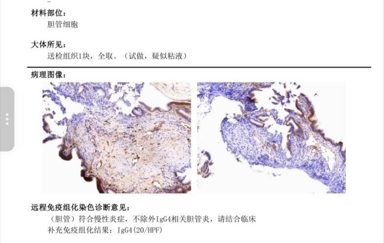 经过消化内镜科团队的操作,祁先生胆道梗阻有所缓解,病理送检不久也有了结果——“(胆管)符合慢性炎症,不除外IgG4相关胆管炎”,此前的判断得到初步印证。随后的补充免疫组化检查显示,祁先生IgG4阳性浆细胞计数达到20个/高倍镜视野(数值超过10即具重要诊断价值)。综合上述检查结果,医生作出“IgG4相关性硬化性胆管炎”的明确诊断。