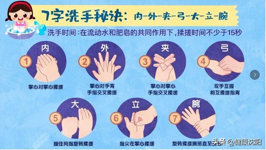 平时洗手,我们习惯用流动清水沾湿双手,然后擦干就完成了洗手的过程,这种方法只能洗掉肉眼可见的灰尘污渍,却无法去除手上的致病微生物。正确的洗手方式应该是:用流动的清水将手部打湿,然后用香皂、洗手液等在手部搓出泡沫,按照“七步洗手法”揉搓双手,再用流动的水冲洗掉手上的泡沫,最后关闭水龙头用毛巾或擦手纸将手擦干即可。