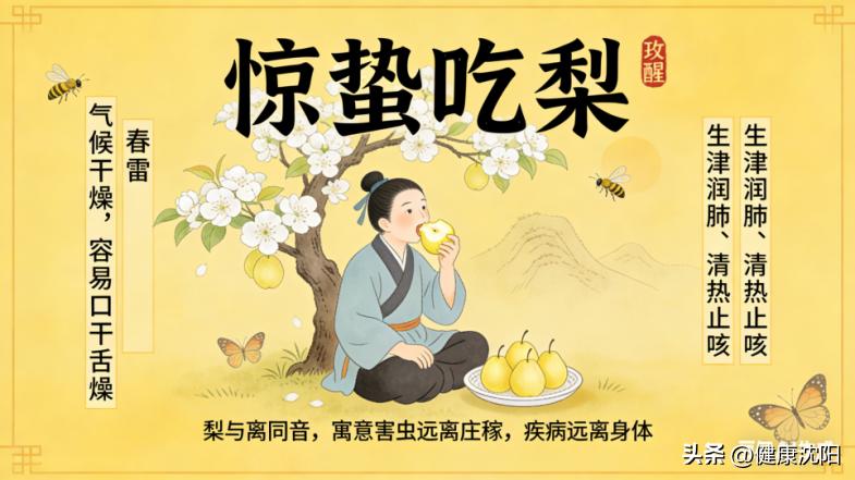吃梨:惊蛰气候干燥,容易口干舌燥。民间有“惊蛰吃梨”的习惯,取其生津润肺、清热止咳之意。同时,“梨”与“离”同音,也寓意让害虫远离庄稼,让疾病远离身体。