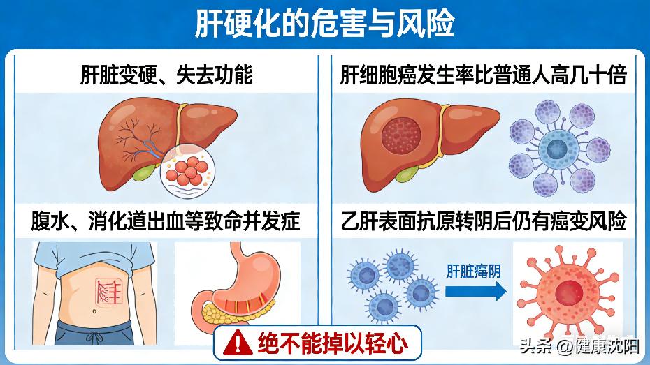一旦发展为肝硬化,肝脏会变硬、失去功能,出现腹水、消化道出血等致命并发症,肝细胞癌的发生率会比普通人高出几十倍。更要警惕的是:即便乙肝表面抗原转阴、看似“治愈”,依然有癌变风险,绝不能掉以轻心。