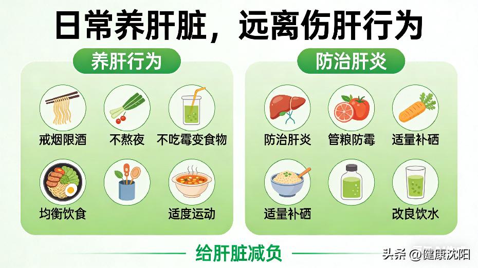 4. 日常养肝脏,远离伤肝行为:戒烟限酒、不熬夜、不吃霉变食物、均衡饮食、适度运动,践行“防治肝炎、管粮防霉、适量补硒、改良饮水”的护肝方针,给肝脏减负。