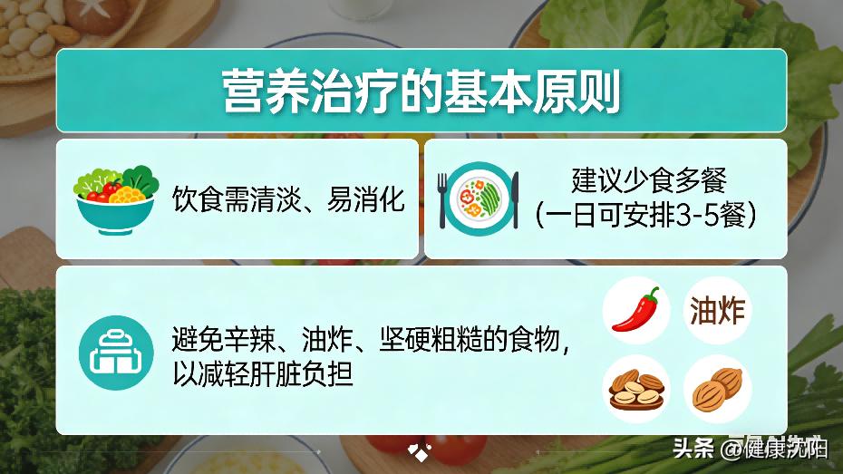 饮食需清淡、易消化。建议少食多餐(一日可安排3-5餐),避免辛辣、油炸、坚硬粗糙的食物,以减轻肝脏负担。