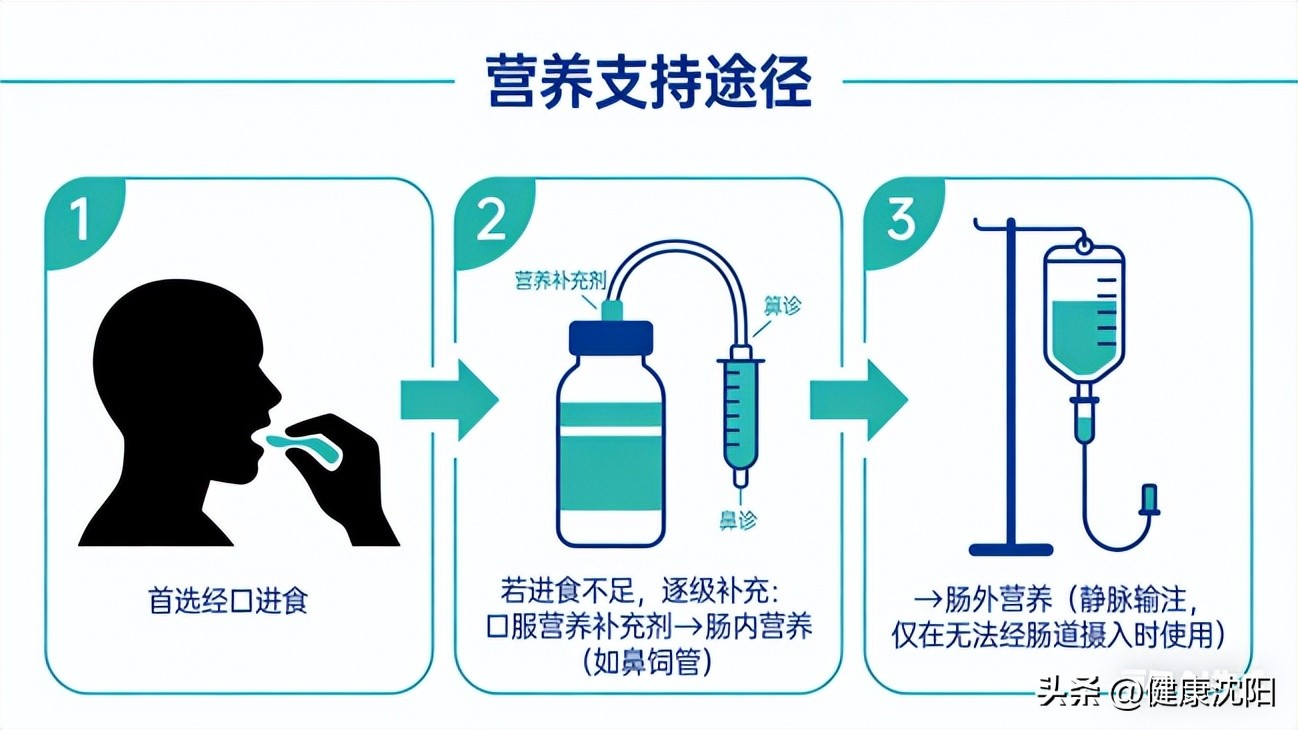 营养支持途径:首选经口进食。若进食不足,应逐级补充:口服营养补充剂→肠内营养(如鼻饲管)→肠外营养(静脉输注,仅在无法经肠道摄入时使用)。